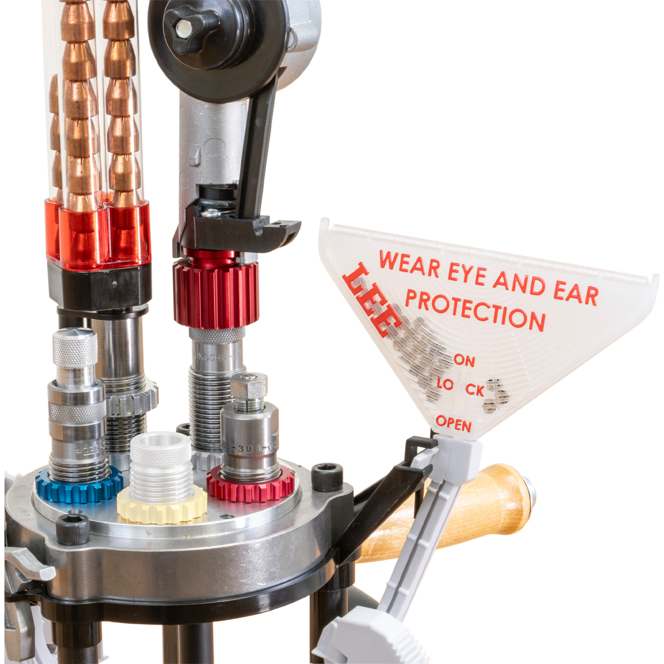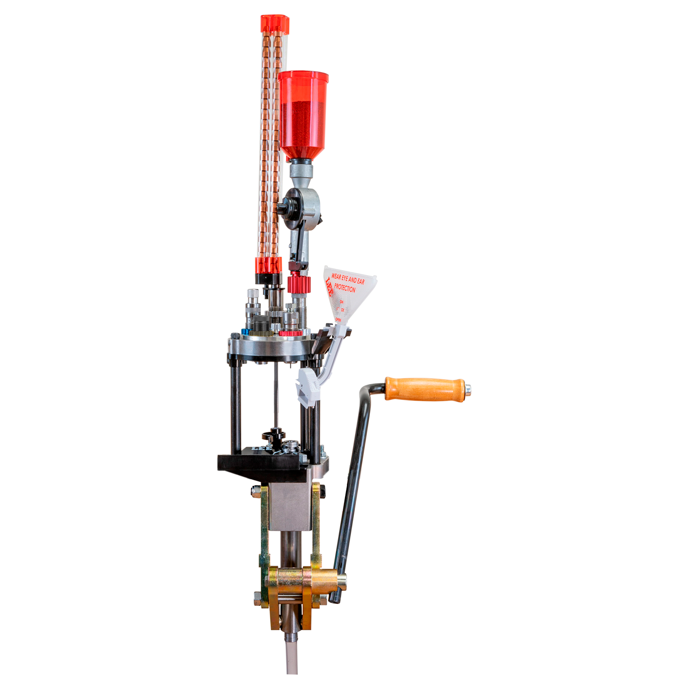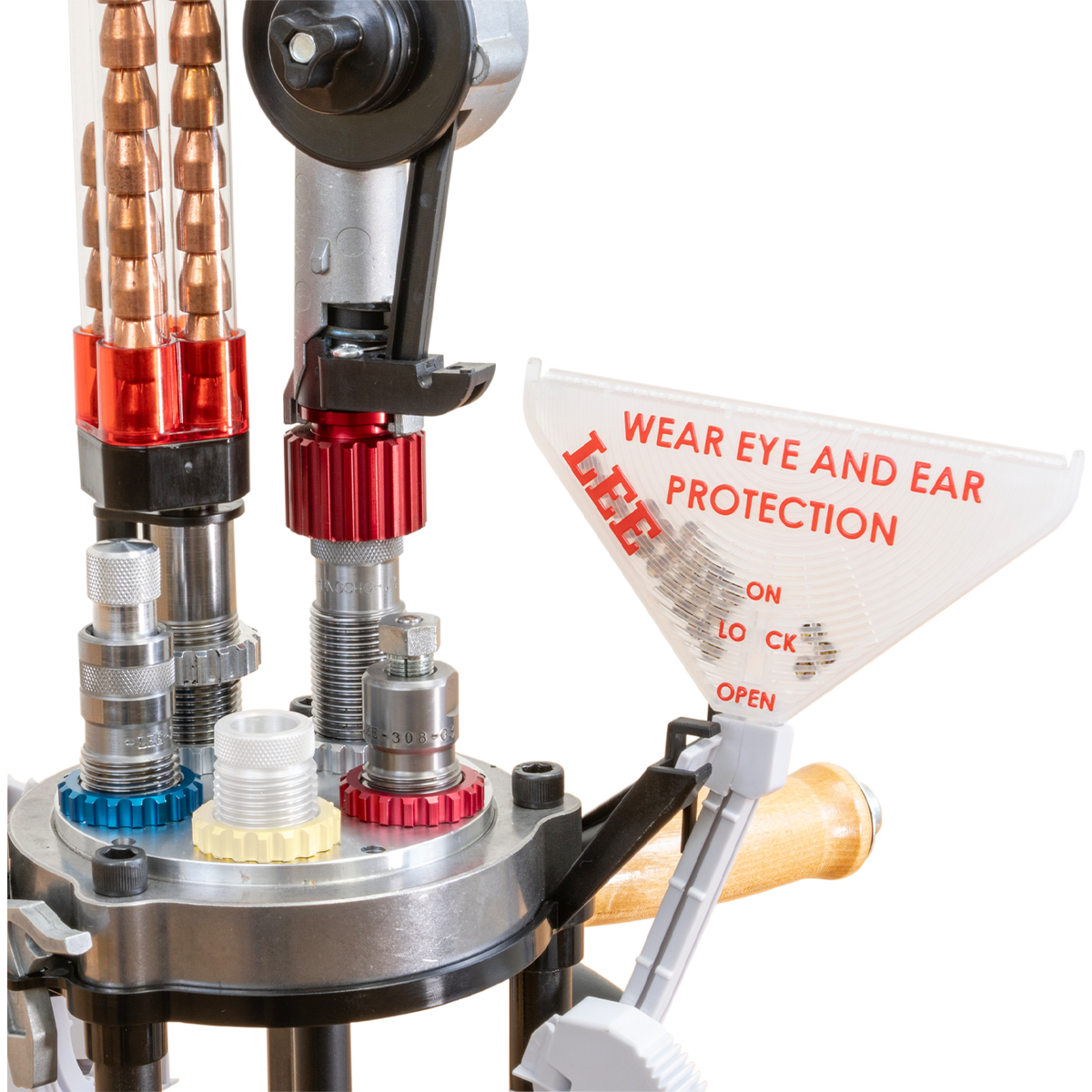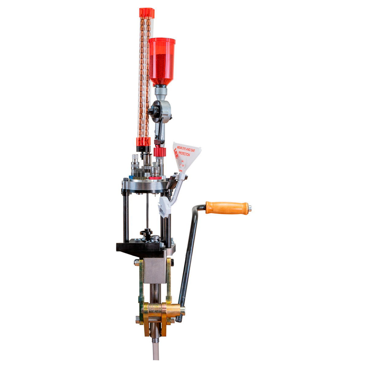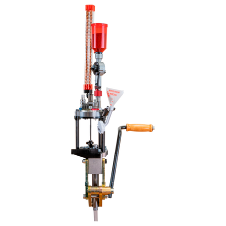 A sua composição em aço reforçado traz mais versatilidade e possibilita uma amplitude maior para sua recarga. Com sua nova torre, que pode variar de três a 6 estações, é possível recarregar do .25 ACP ao .50 BMG. É isso mesmo! Uma semiprogressiva com giro automático e troca rápida que recarrega grandes calibres.